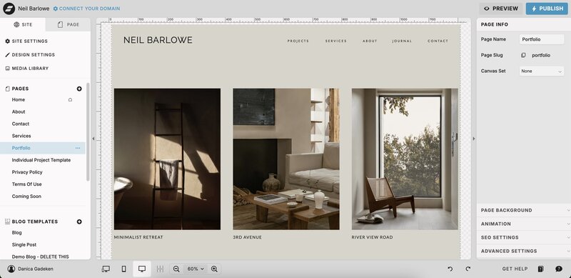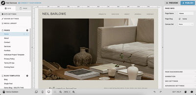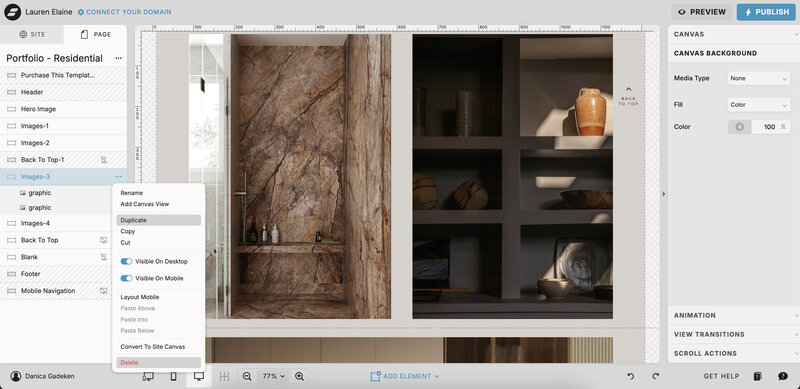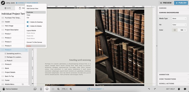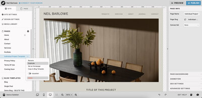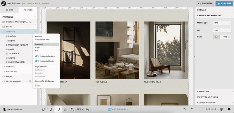To add more photos to your portfolio, click on your desired portfolio page, select the "Page" tab in the top left panel, locate which canvas you'd like to duplicate and click on the three dots next to the name, click "Duplicate". A new, duplicated canvas will appear below. Feel free to drag the canvas up or down if you'd like. In the duplicated canvas, swap out the images.