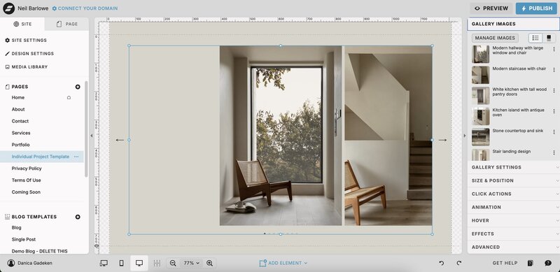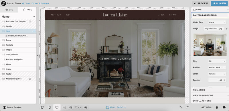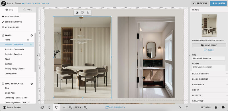 The portfolio in the Lauren Elaine template is divided into 3 categories: Residential, Commercial, & Exteriors. Feel free to rename the categories to whatever you like.