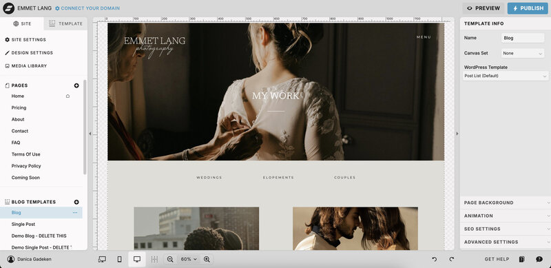 For the Emmet Lang template, you will share your portfolio of work (aka your gallery) via your blog. Here you will be able to categorize your photoshoots, share a short story about each, and upload your favorite photos.