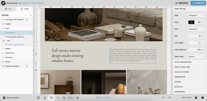 To change the font, size, color, letter spacing, line height, or alignment, select the text box and then click on the "Text Style" tab in the right side panel. There you will see options to change all of the above. To split the text styles between desktop and mobile view, hover over one of the settings and click on the three dots (⋮), then select "Split Mobile & Desktop." To learn how to upload your own custom font, read this article. For more information on text properties, view Showit's help page here.