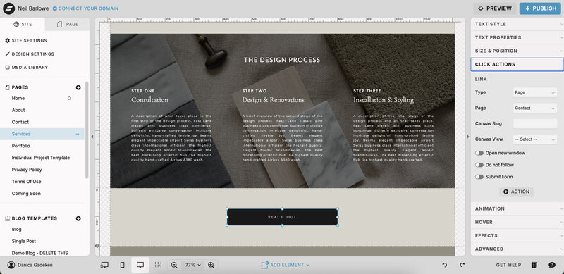 To add or change a link within your template, select the text, button, icon, or image. Then select the "Click Actions" tab in the right panel. Next to "Type", select the drop down menu where you can choose if you would like to link to a page within your website, a URL, your social media, or other. Read more about your link options here.