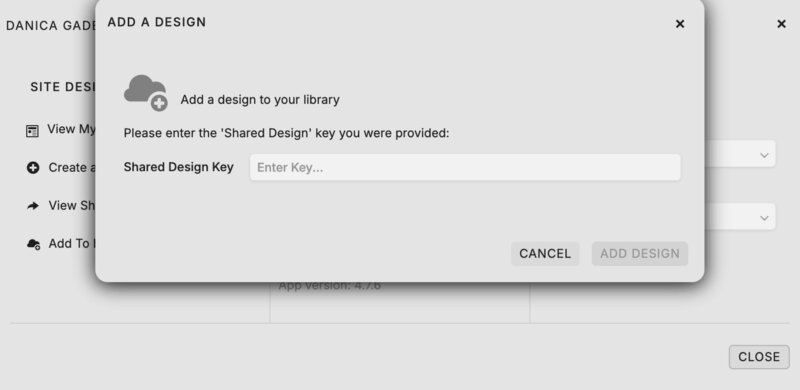 Input your Share Key code and click the "Add Design" button. You can find your unique Share Key code in your order confirmation email.