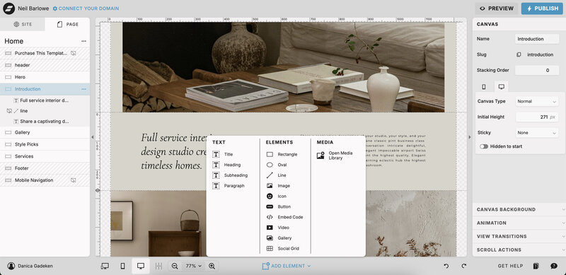 To add a heading, subheading, or paragraph, select the canvas in which you want to add text. Then hover over "Add Element" and select your preferred text block.