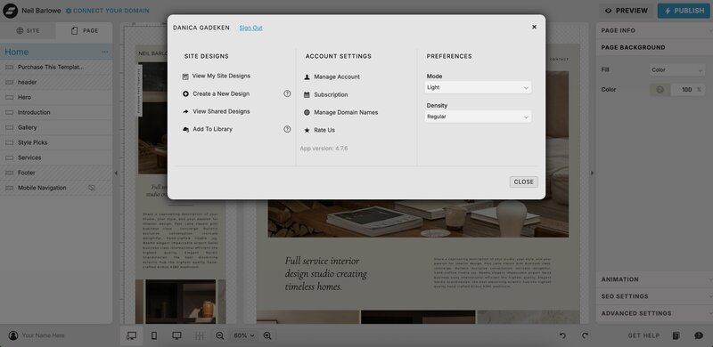 If you have previously used Showit, the Design App will open as shown below. Open the user settings by clicking on your name in the bottom left corner of the screen, then select "Add To Library."